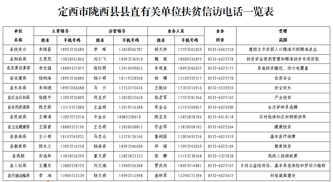 根据《全县扶贫领域信访工作专项行动方案》要求,为方便群众进行政策咨询、信访投诉,切实维护贫困群众合法权益,推进问题及时就地解决,现将县扶贫办、县财政局、县发展改革委等14个承担脱贫攻坚重点任务的行业部门主要领导、分管领导、业务人员、业务科室电话号码和主要受理范围予以公告。电话受理时间为工作日上午8:30至12:00,下午2:30至6:00。
